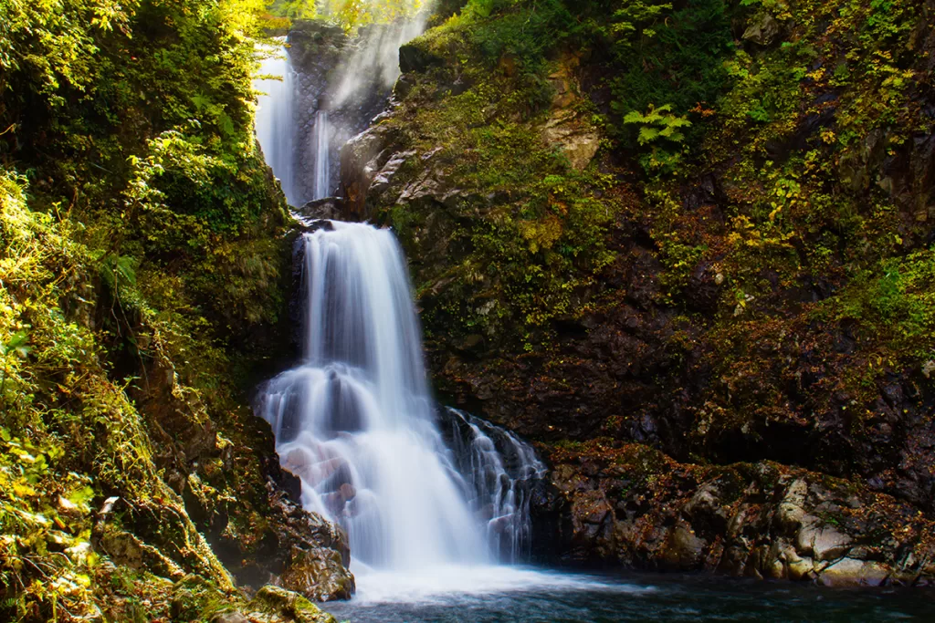西吾妻山から流れるしぶきが山伏が身にまとう白い布のように見える落差30mの滝。